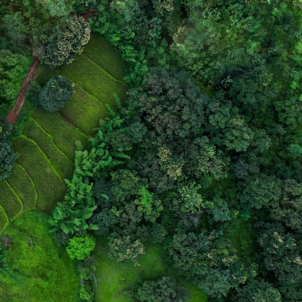 Dense forest cover, winding natural paths, and open clearings define the landscape of Mani Forest. Seen from above, the area reflects untouched greenery and the raw beauty of nature preserved over time.