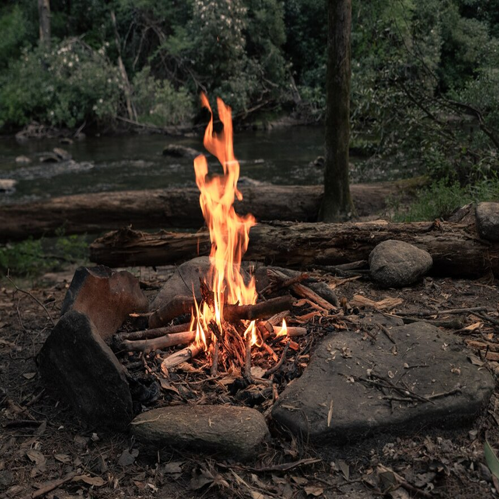 Relax beside a warm bonfire under the forest sky.